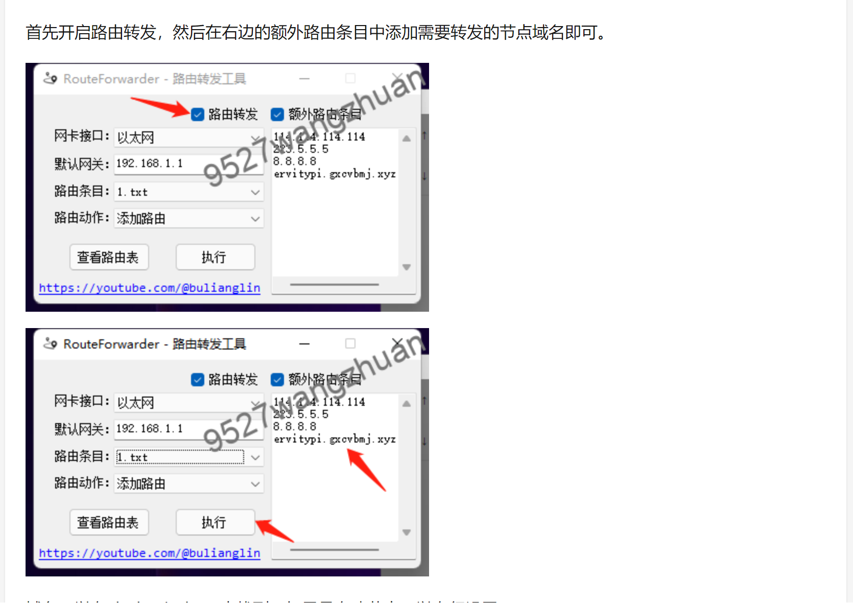 首先开启路由转发,然后在右边的额外路由条目中添加需要转发的节点域名即可。