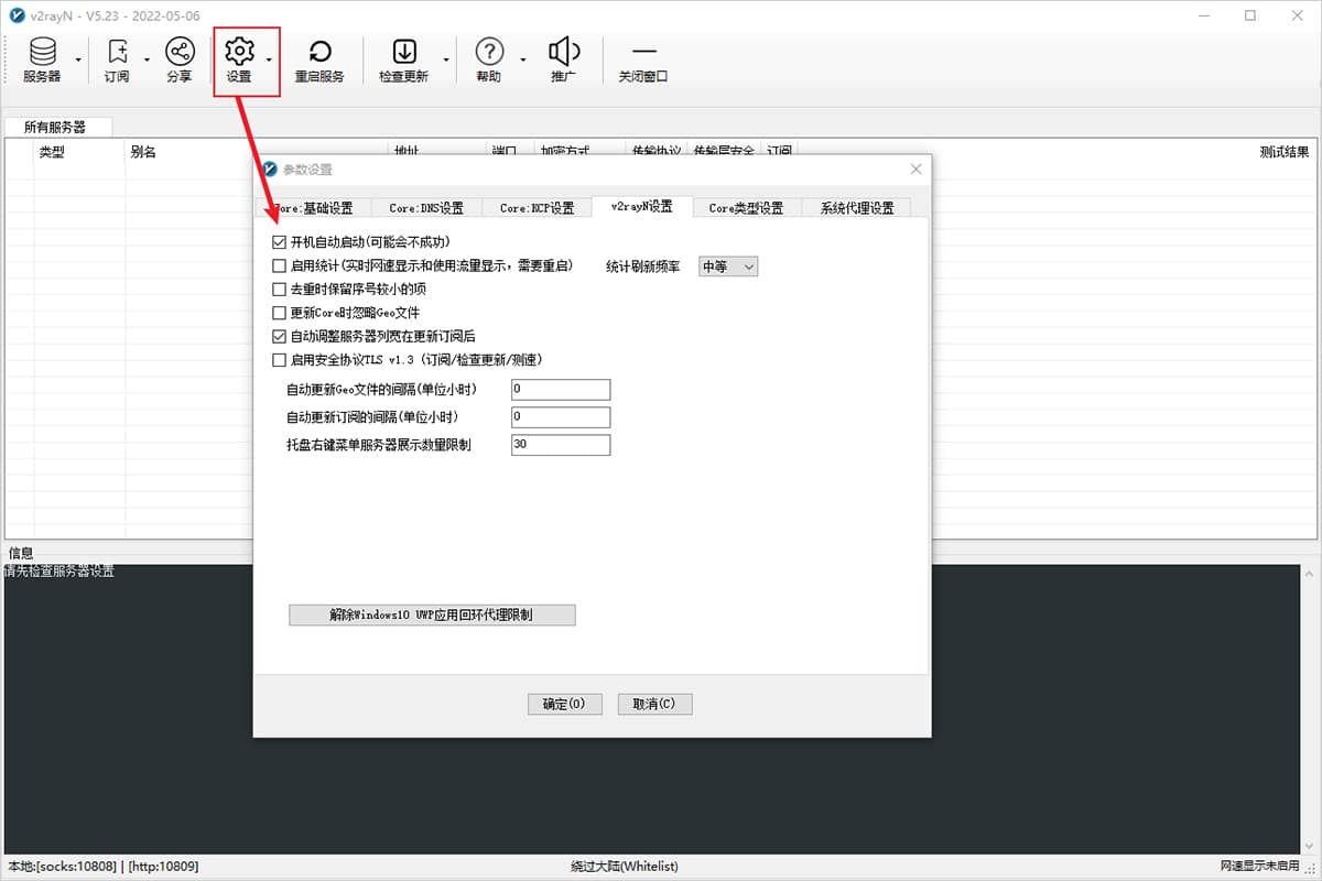 在点击软件主界面的设置,点击参数设置进入参数设置页面后,选择v2rayN设置标签页,勾选上开机自动启动复选框,然后点击确认,如下图所示。